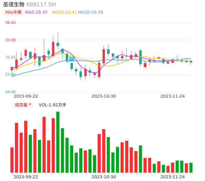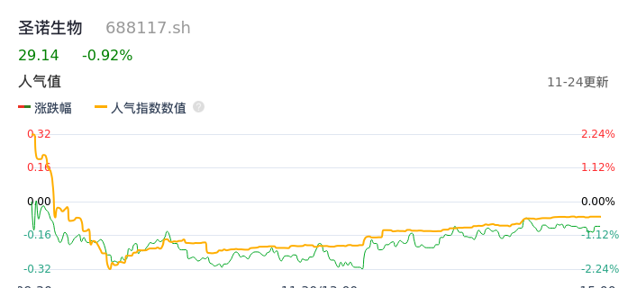 11月24日,圣诺生物收报29.14,股价涨幅-0.92%,成交金额5561.15万元,换手率2.89%。