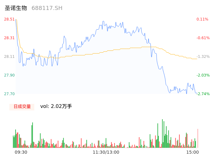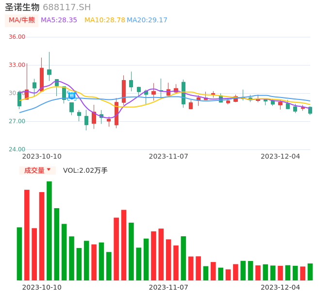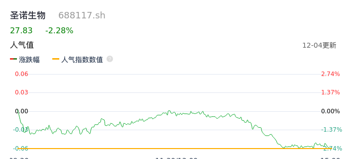 12月04日,圣诺生物收报27.83,股价涨幅-2.28%,成交金额5661.70万元,换手率3.05%。