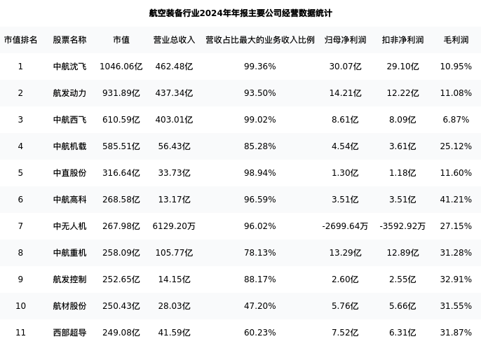 西部超导最新报告期数据为年报,下表汇总了航空装备行业内市值靠前的公司年报主要经营数据