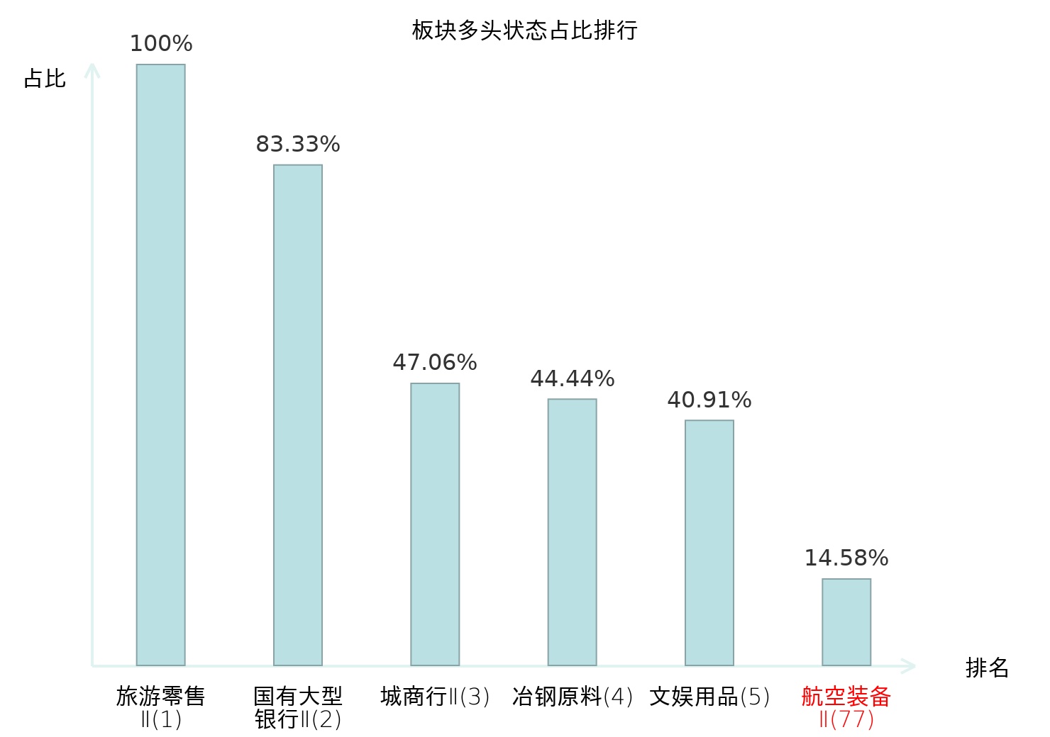 全市场所有行业板块中主力多头状态占比排名中,旅游零售Ⅱ板块位居第一。旅游零售Ⅱ板块名次提升最快,较昨日上升130位。