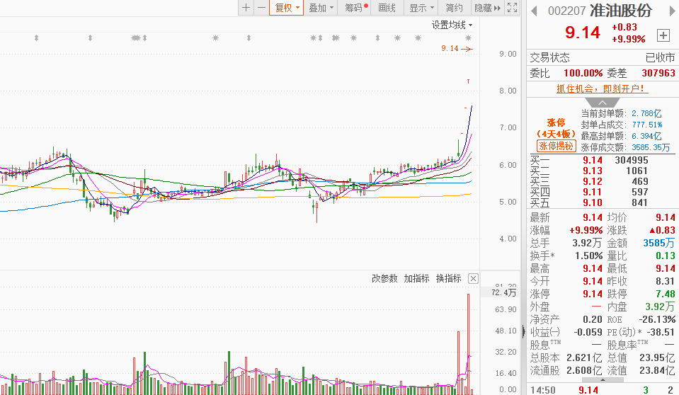 市场情绪:受陆家嘴金融论坛发布的政策刺激,市场热点主要集中在了电子硬件等相关科技板块,个股跌多涨少,全市场超3400只个股下跌。今日共40股涨停,连板股总数11只,17股封板未遂,封板率为70%(不含ST股、退市股)。焦点股方面,稳定币概念股东信和平8天5板、协鑫能科4连板,油气板块准油股份、山东墨龙、贝肯能源均晋级4连板,甲醇产业链的华阳新材金牛化工4连板。