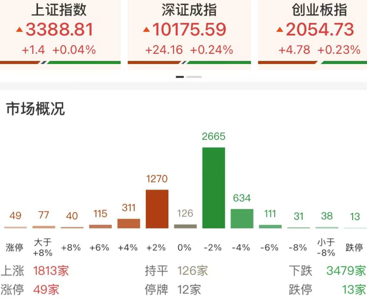 市场全天探底回升,三大指数小幅上涨。沪深两市全天成交额1.19万亿,较上个交易日缩量161亿。盘面上,算力硬件股再度走强,沪电股份等多股涨停;军工股震荡走高,北方长龙20CM涨停。AI眼镜概念股持续活跃,比依股份涨停。下跌方面,农药、新消费、CRO、稀土永磁等概念股回调。涨跌幅方面,PCB、CPO、存储芯片、AI眼镜等板块涨幅居前;美容护理、草甘膦、稀土永磁、脑机接口等板块跌幅居前。截至收盘,沪指涨0.04%,深成指涨0.24%,创业板指涨0.23%。