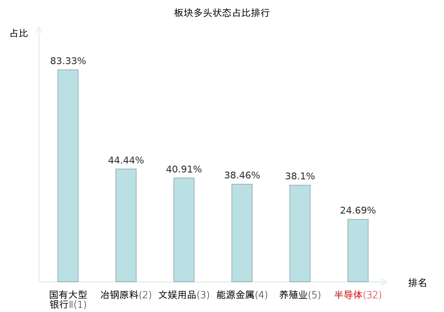 全市场所有行业板块中主力多头状态占比排名中,国有大型银行Ⅱ板块位居第一。影视院线板块名次提升最快,较昨日上升54位。