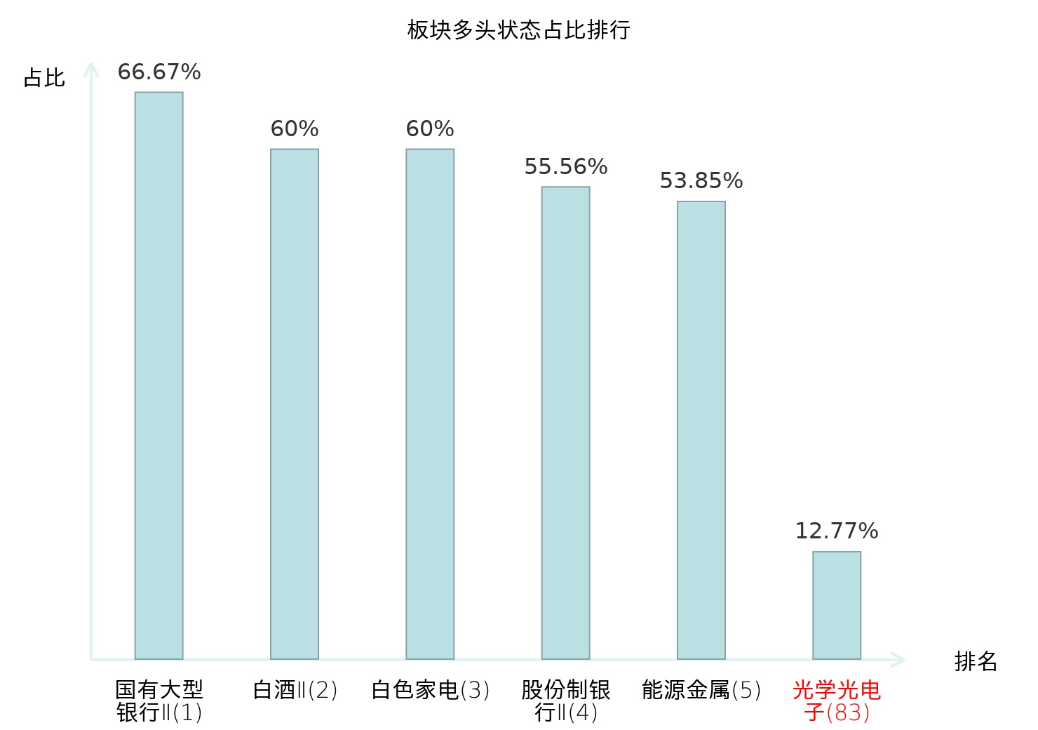 全市场所有行业板块中主力多头状态占比排名中,国有大型银行Ⅱ板块位居第一。电子化学品Ⅱ板块名次提升最快,较昨日上升55位。