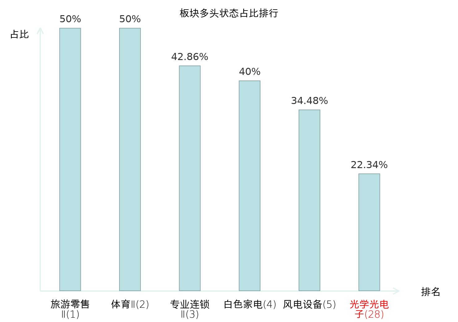 全市场所有行业板块中主力多头状态占比排名中,旅游零售Ⅱ板块位居第一。能源金属板块名次提升最快,较昨日上升50位。