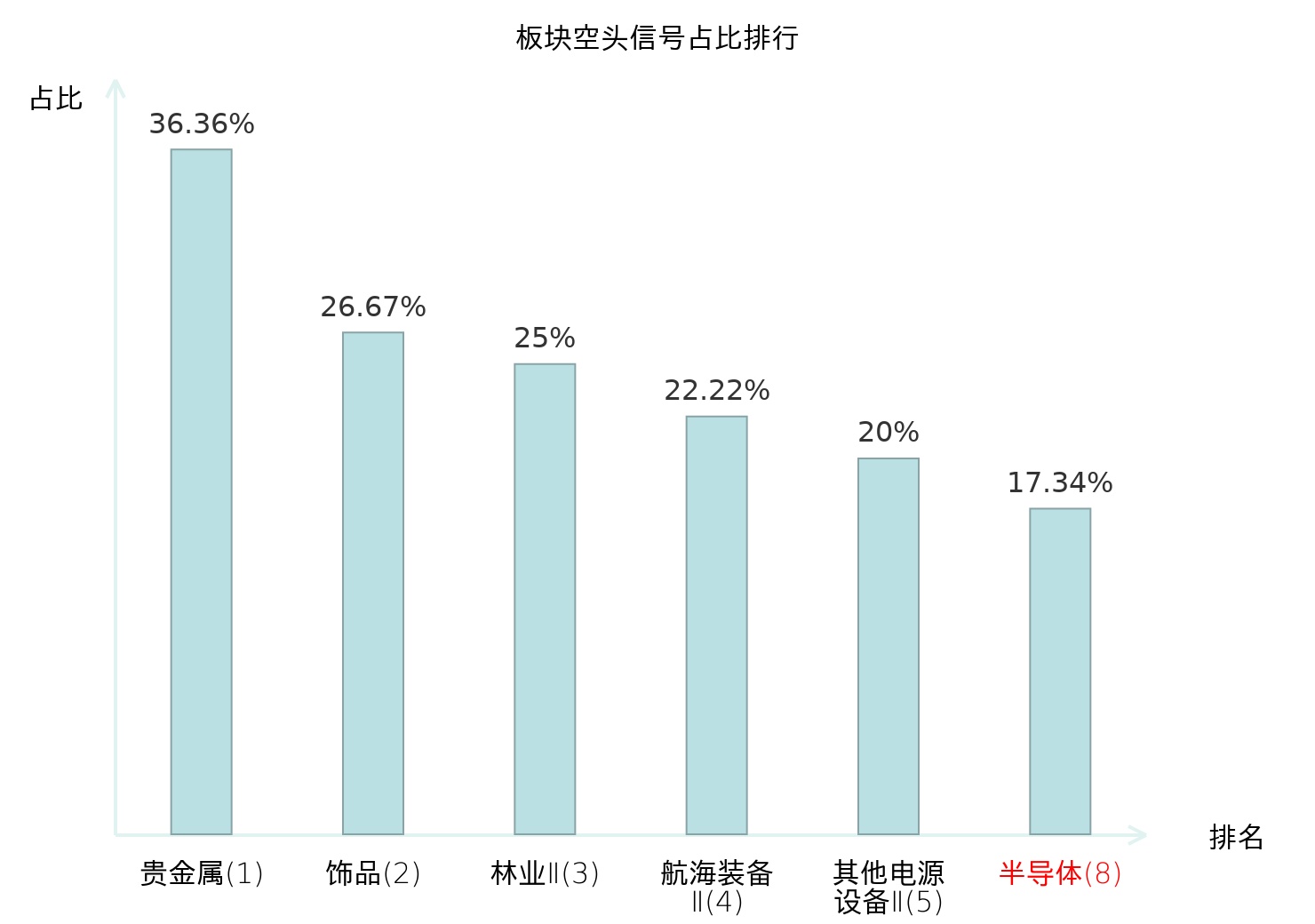 全市场所有行业板块中主力空头信号占比排名中,贵金属板块位居第一。工业金属板块名次提升最快,较昨日上升125位。