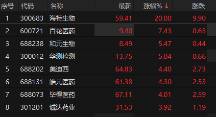上证报中国证券网讯 8月25日午后,CRO概念股表现活跃,截至13时36分,海特生物20cm涨停,百花医药涨逾7%,和元生物、华测检测涨超5%,美迪西、皓元医药等跟涨。
