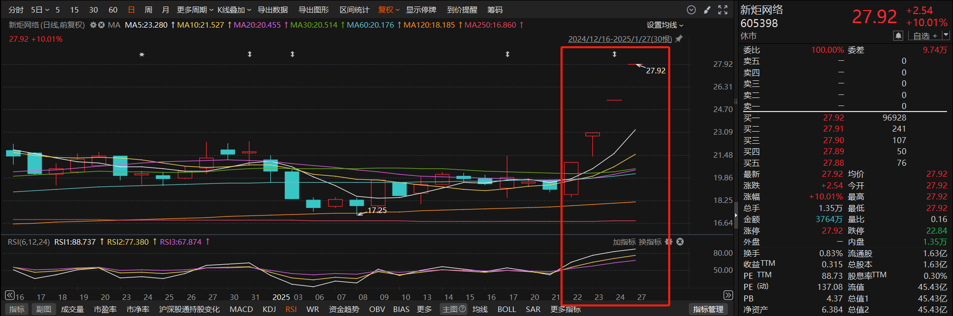 AI智能体概念股表现强势,截至节前最后一个交易日收盘,布局IT运维智能体业务的新炬网络斩获4连板,构建财税AI Agent智能体的金财互联实现2连板,与智谱合作开发AI Agent智能体的视觉中国录得2连板,初步完成智能体工具链(PanAgent)的普联软件20CM涨停,通过召唤小艺实现智能体服务的彩讯股份涨超15%。