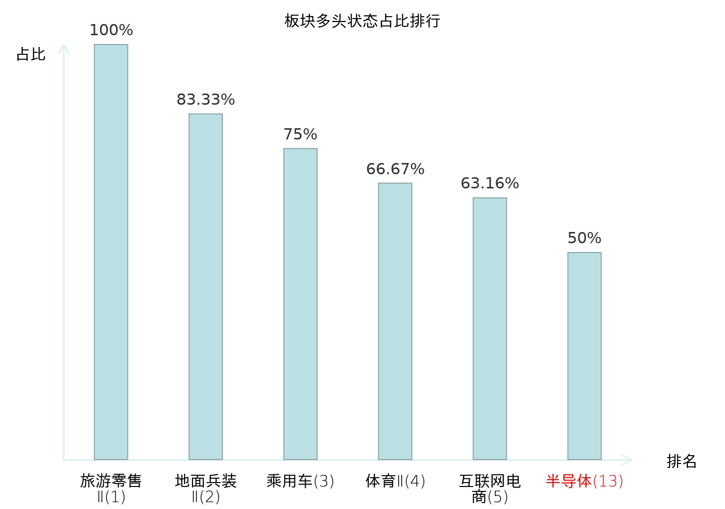 全市场所有行业板块中主力多头状态占比排名中,旅游零售Ⅱ板块位居第一。消费电子板块名次提升最快,较昨日上升52位。