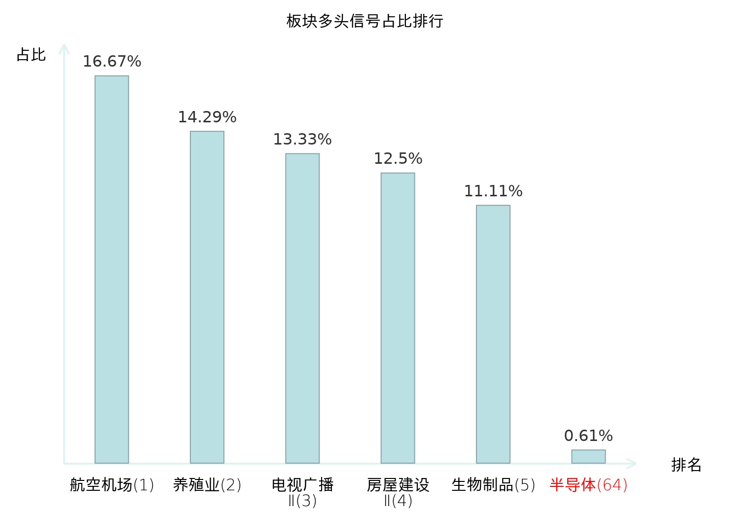全市场所有行业板块中主力多头信号占比排名中,航空机场板块位居第一。航空机场板块名次提升最快,较昨日上升113位。