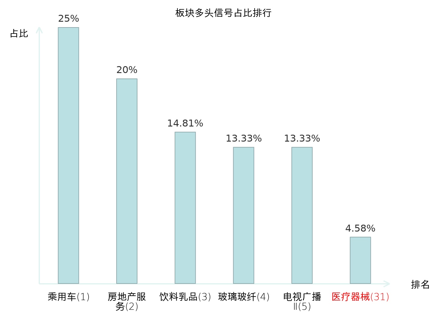 全市场所有行业板块中主力多头信号占比排名中,乘用车板块位居第一。乘用车板块名次提升最快,较昨日上升117位。