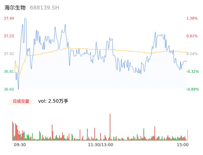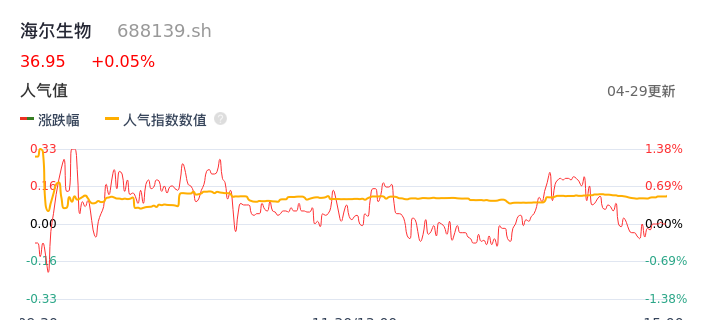 04月29日,海尔生物收报36.95,股价涨幅0.05%,成交金额9269.76万元,换手率0.79%。