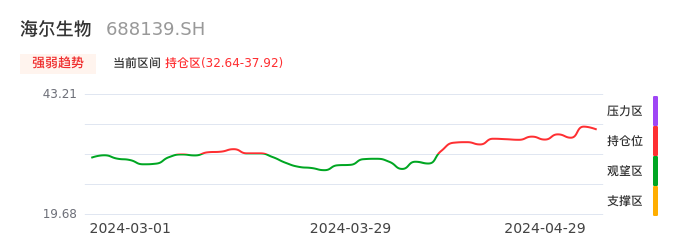 我们来看一下该股的九方特色指标强弱趋势的情况:海尔生物自04月11日从观望区上穿到持仓区。股价近期在多头区域持续强势上扬,上升动能仍较为充足,可积极关注。后续重点关注上方压力位:37.92元是否能突破上攻。