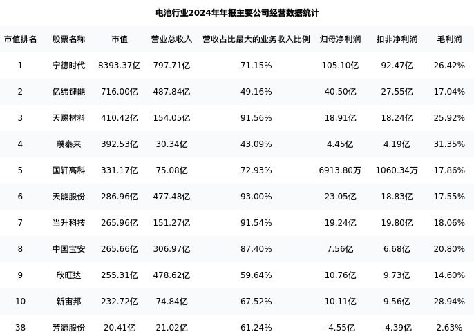 芳源股份最新报告期数据为年报,下表汇总了电池行业内市值靠前的公司年报主要经营数据