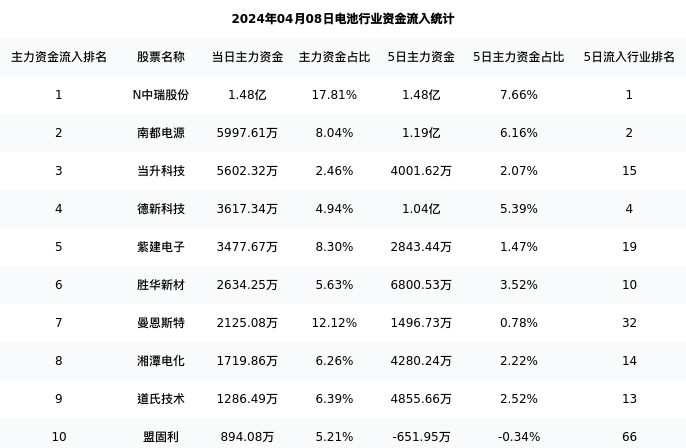 从主力资金流向来看,电池行业今日主力资金流入99.67亿元,在所有申万二级行业中排名:113/131。