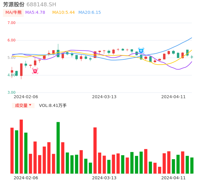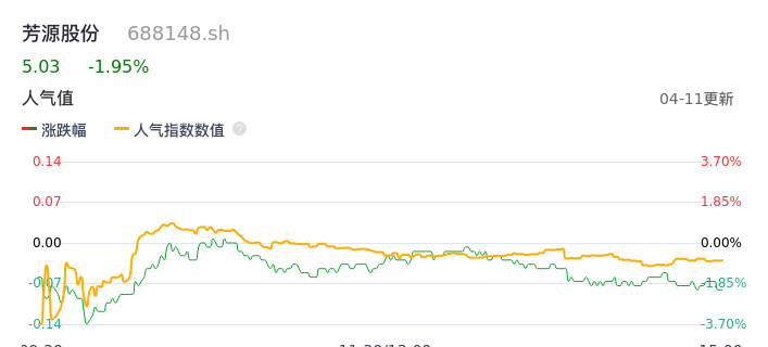 04月11日,芳源股份收报5.03,股价涨幅-1.95%,成交金额4241.30万元,换手率2.18%。