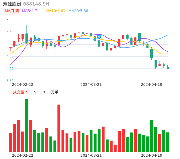 04月19日,芳源股份收报4.00,股价涨幅-3.15%,成交金额3776.85万元,换手率2.42%。