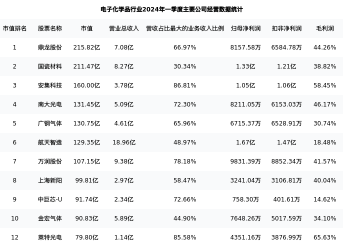 莱特光电最新报告期数据为一季度,下表汇总了电子化学品行业内市值靠前的公司一季度主要经营数据