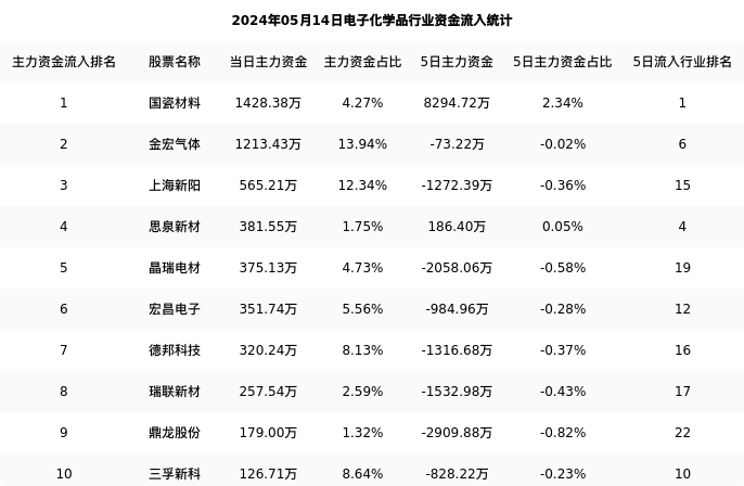 从主力资金流向来看,电子化学品行业今日主力资金流入6.45亿元,在所有申万二级行业中排名:37/131。