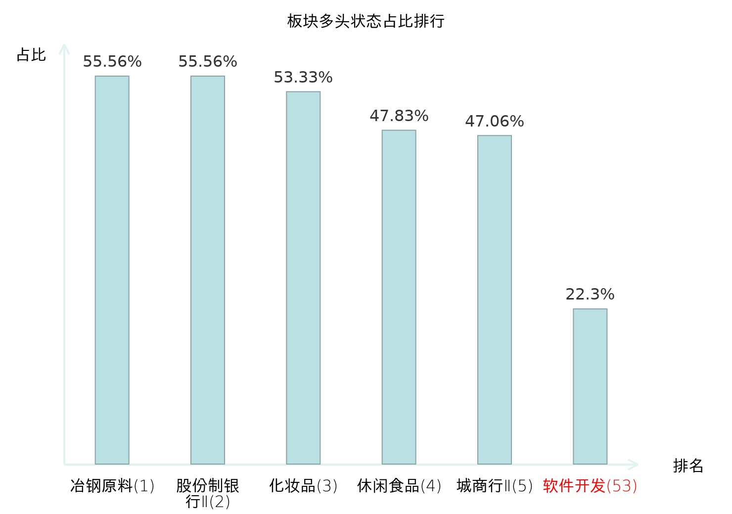 全市场所有行业板块中主力多头状态占比排名中,冶钢原料板块位居第一。其他家电Ⅱ板块名次提升最快,较昨日上升105位。