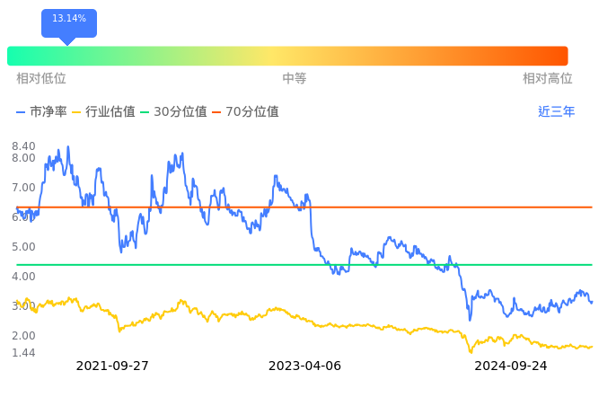 松井股份当前市净率PB为3.20,在所属的化学制品中,市净率PB排145,前五名分别为吉华集团市净率0.59、闰土股份市净率0.67、苏博特市净率0.72、久日新材市净率0.73、爱普股份市净率0.79。松井股份当前市净率PB为3.20,超过近3年13.14%的历史数据。