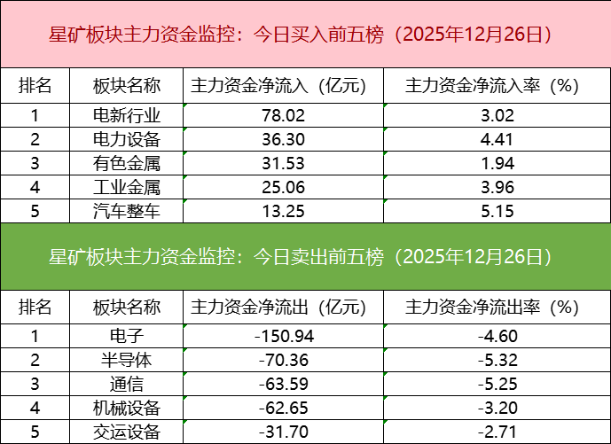 从主力板块资金监控数据来看,电新行业主力资金净流入居首。