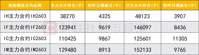 四大期指主力合约中,IH、IF、IC、IM合约多空双方均加仓,IH、IF合约多头加仓数量较多,IC、IM合约空头加仓数量较多。