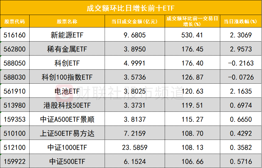从成交额环比增长前十的ETF来看,新能源ETF(516160)成交额环比增长530%位居首位;稀有金属ETF(562800)成交额环比增长176%位居次席。