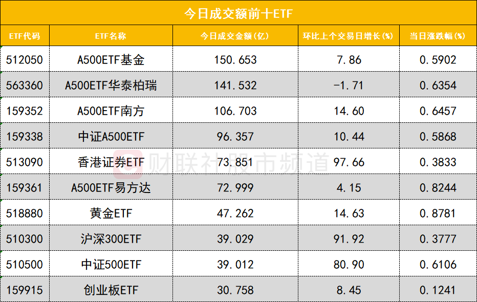 从成交额前十的ETF来看,A500ETF基金(512050)成交额位居首位,A500ETF华泰柏瑞(563360)成交额位居次席。