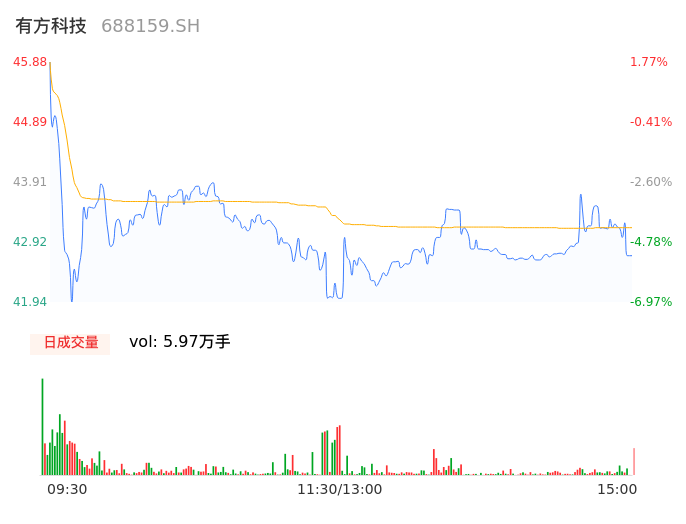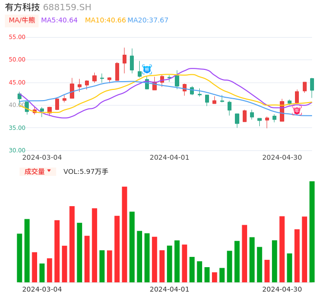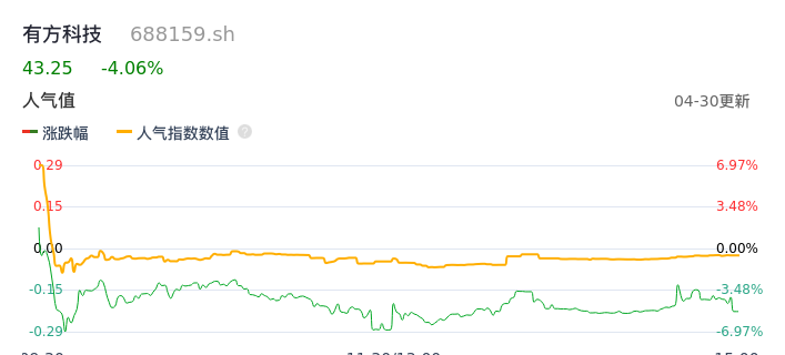 04月30日,有方科技收报43.25,股价涨幅-4.06%,成交金额2.58亿元,换手率6.51%。
