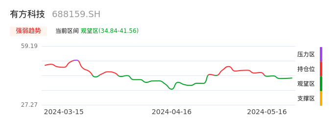我们来看一下该股的九方特色指标强弱趋势的情况:有方科技自05月10日从持仓区下穿到观望区。股价近期持续下跌后,短期出现止跌迹象。后续重点关注能否再次站上多空分界点:41.56元。如未能有效突破则可能进入新一轮空头行情。