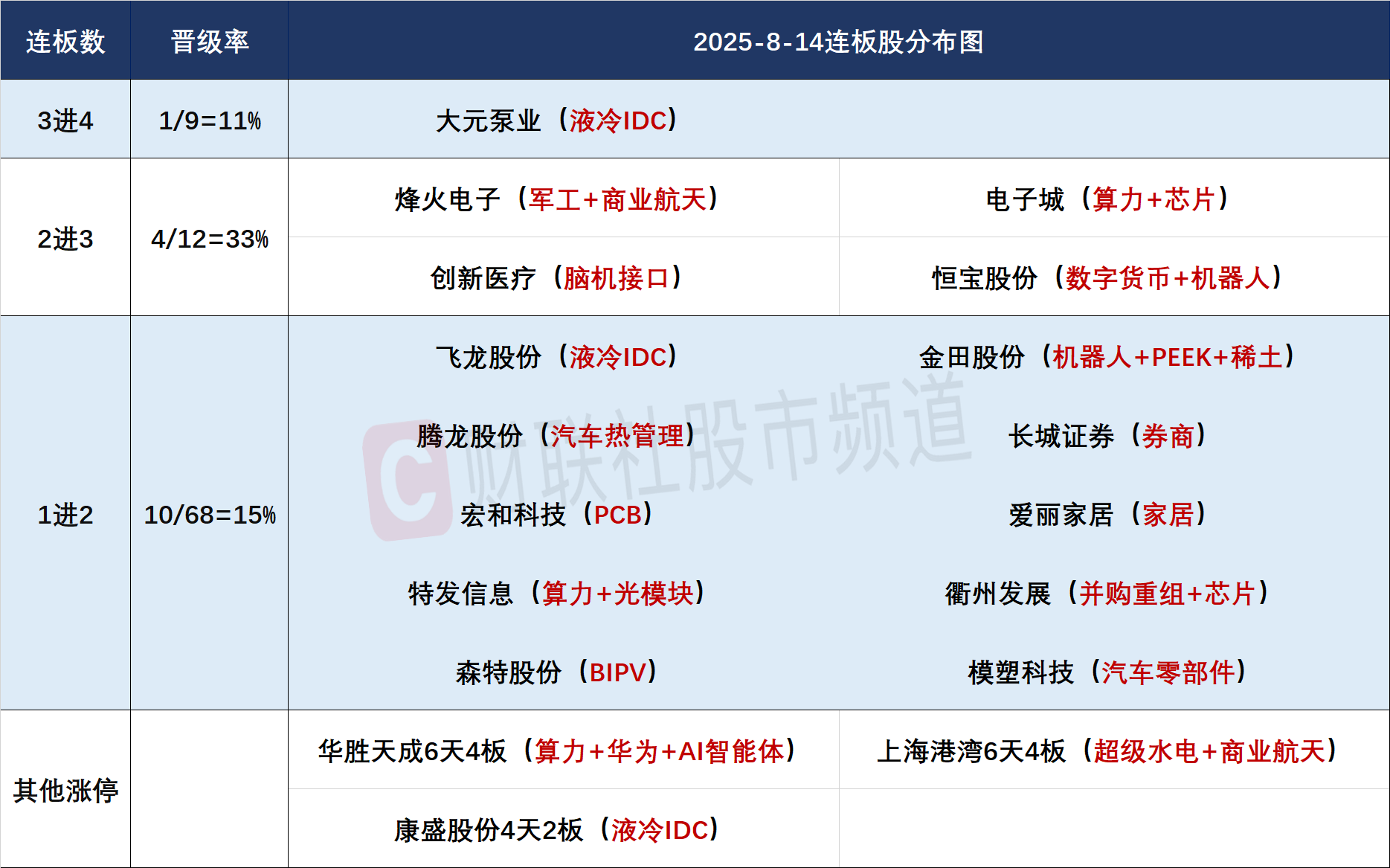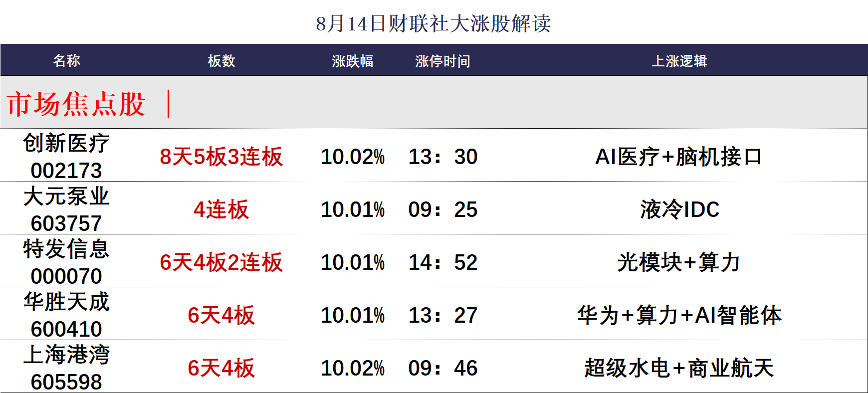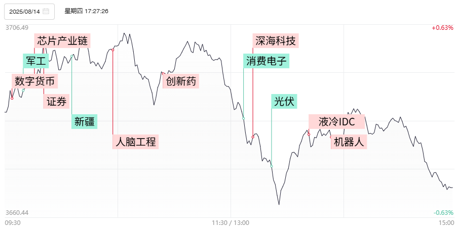 财联社8月14日讯,今日44股涨停,31股炸板,封板率为59%,大元泵业4连板,恒宝股份、烽火电子、电子城3连板,创新医疗8天5板,上海港湾、特发信息、华胜天成6天4板。市场全天震荡调整,创业板指领跌,沪指3700点得而复失,终结8连阳。沪深两市全天成交额2.28万亿,较上个交易日放量1283亿。盘面上,市场热点较为杂乱,个股跌多涨少,全市场超4600只个股下跌。板块方面,保险、脑机接口、数字货币、电机等板块涨幅居前,军工、CPO、铜箔、锂矿等板块跌幅居前。截至收盘,沪指跌0.46%,深成指跌0.87%,创业板指跌1.08%。