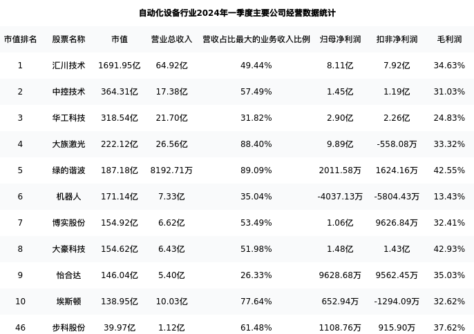 步科股份最新报告期数据为一季度,下表汇总了自动化设备行业内市值靠前的公司一季度主要经营数据