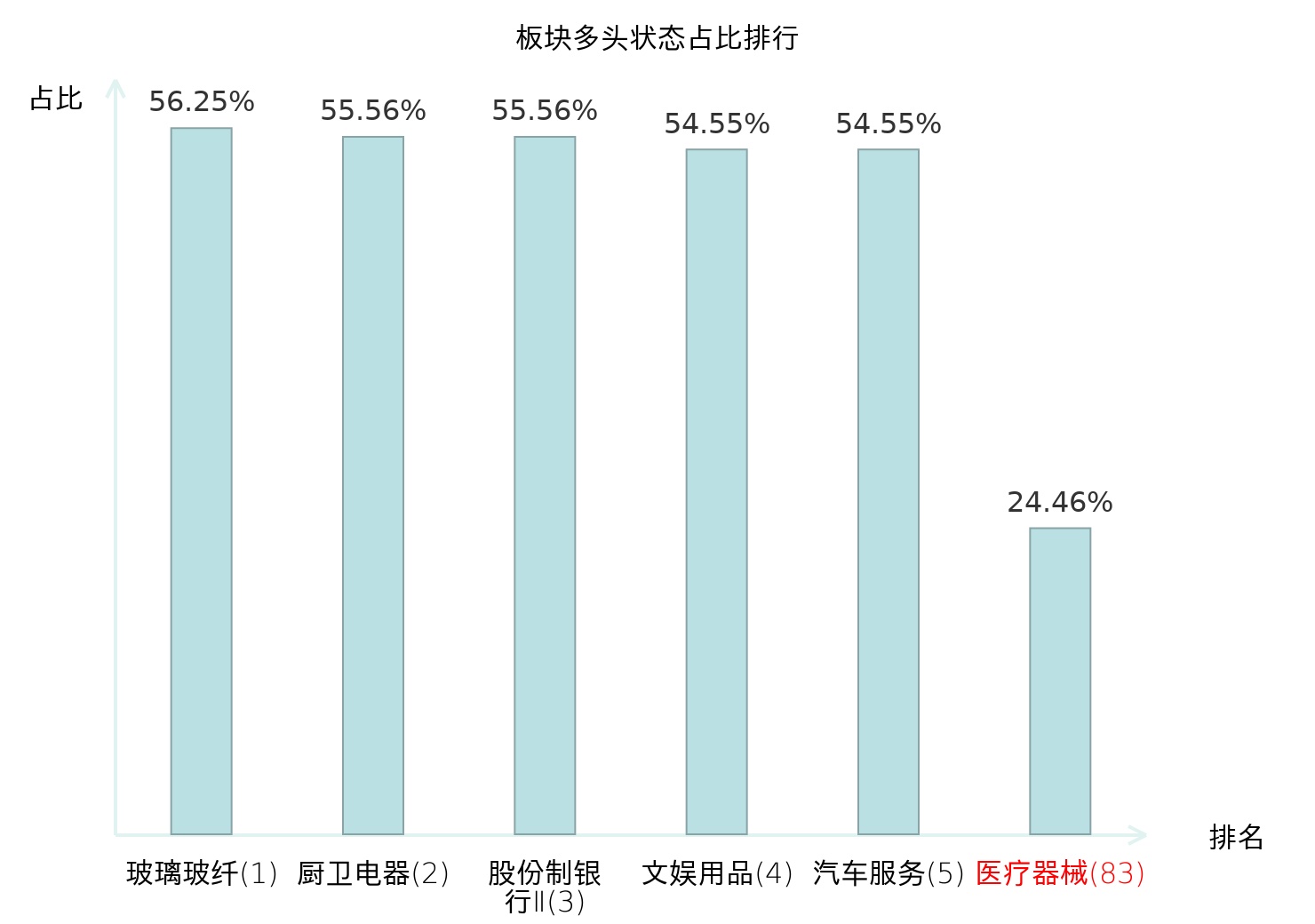 全市场所有行业板块中主力多头状态占比排名中,玻璃玻纤板块位居第一。航天装备Ⅱ板块名次提升最快,较昨日上升84位。