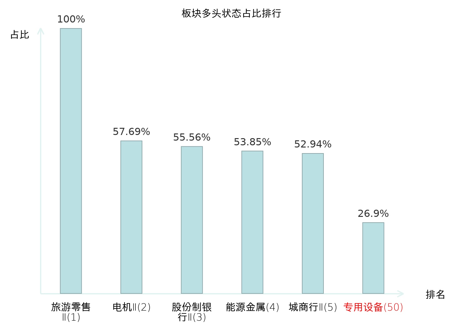 全市场所有行业板块中主力多头状态占比排名中,旅游零售Ⅱ板块位居第一。地面兵装Ⅱ板块名次提升最快,较昨日上升99位。