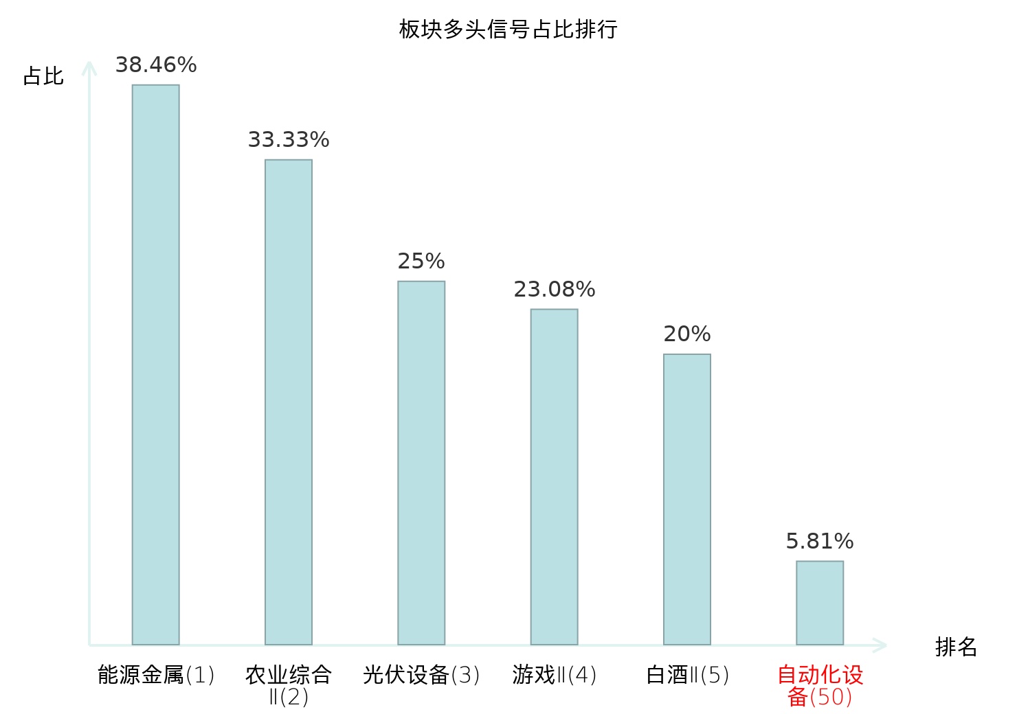 全市场所有行业板块中主力多头信号占比排名中,能源金属板块位居第一。农业综合Ⅱ板块名次提升最快,较昨日上升126位。