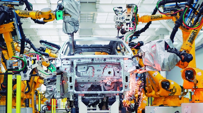 奇瑞汽车智造一工厂冲压车间内,一台台机械臂有节奏地挥舞,满足多款车型几十种参数的混合车型产线正加紧生产,现场焊花四溅,平均1分钟下线一辆新车。