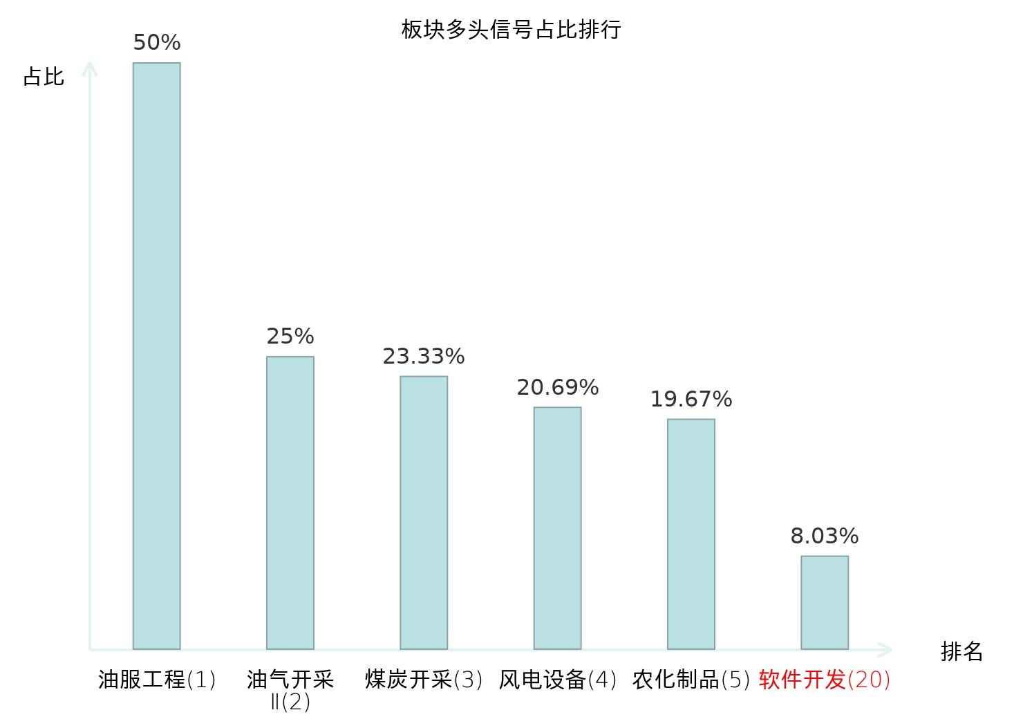 全市场所有行业板块中主力多头信号占比排名中,油服工程板块位居第一。油气开采Ⅱ板块名次提升最快,较昨日上升125位。