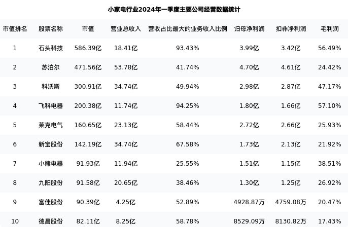 石头科技最新报告期数据为一季度,下表汇总了小家电行业内市值靠前的公司一季度主要经营数据