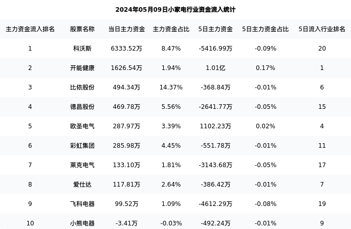 从主力资金流向来看,小家电行业今日主力资金流入10.10亿元,在所有申万二级行业中排名:15/131。