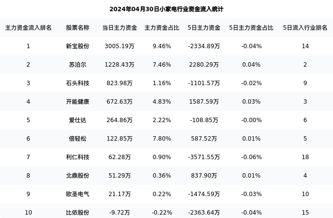 从主力资金流向来看,小家电行业今日主力资金流入9.43亿元,在所有申万二级行业中排名:10/131。