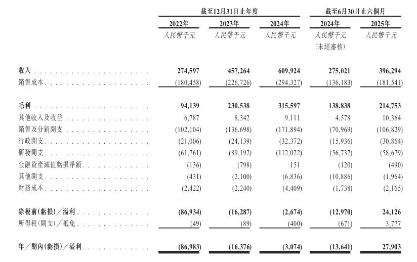 据聆讯后资料集显示,卧安机器人的营业收入从2022年的2.7亿元快速增长至2024年的6.1亿元;2025年上半年收入为3.96亿元,较去年同期的2.75亿元增长44%。此外,其毛利增长更为显著,从2022年的0.94亿元增至2024年的3.16亿元,2025年上半年毛利达到2.148亿元。