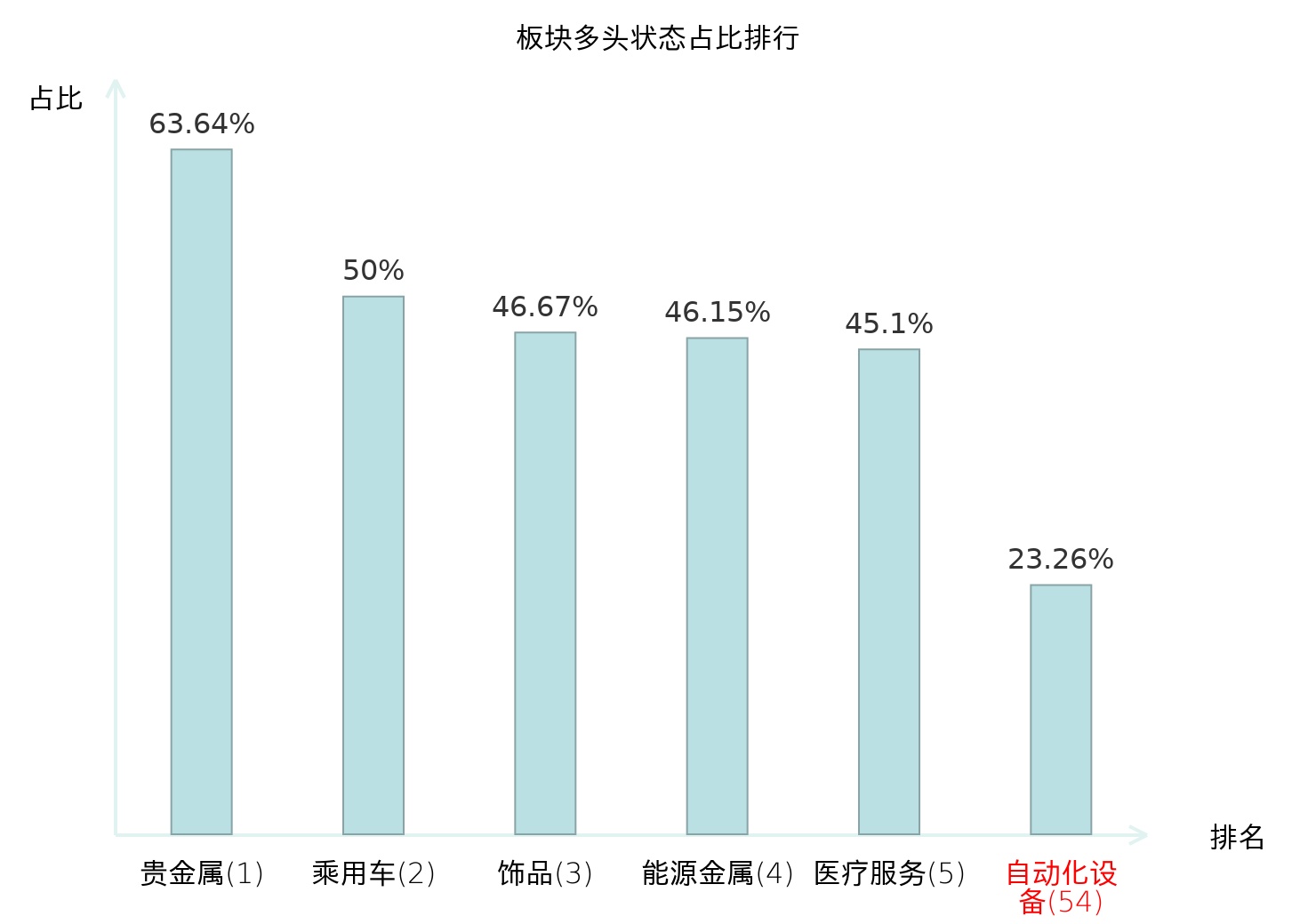 全市场所有行业板块中主力多头状态占比排名中,贵金属板块位居第一。电机Ⅱ板块名次提升最快,较昨日上升61位。