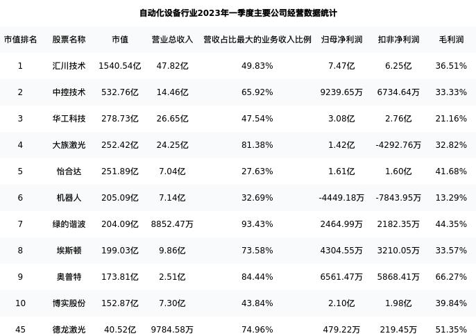 德龙激光最新报告期数据为一季度,下表汇总了自动化设备行业内市值靠前的公司一季度主要经营数据