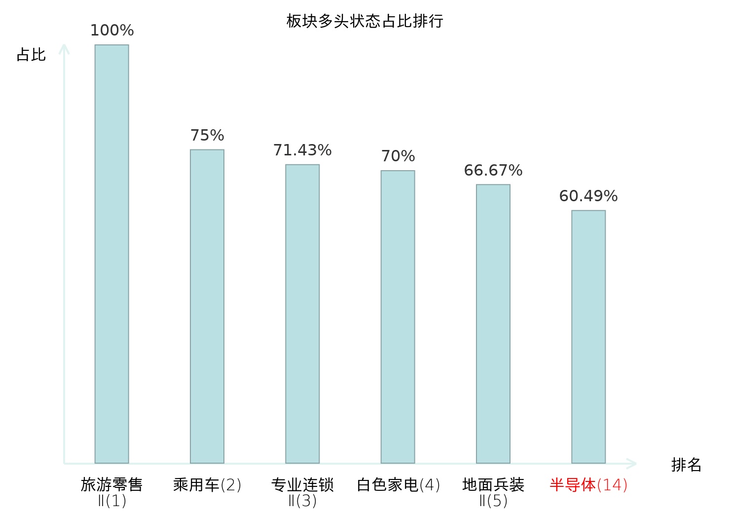 全市场所有行业板块中主力多头状态占比排名中,旅游零售Ⅱ板块位居第一。焦炭Ⅱ板块名次提升最快,较昨日上升105位。