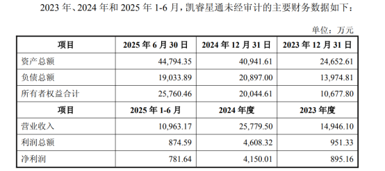 截至2025年6月30日,凯睿星通资产总额4.48亿元,所有者权益合计2.58亿元。2025年上半年,凯睿星通实现营收1.1亿元,净利润781.64万元。