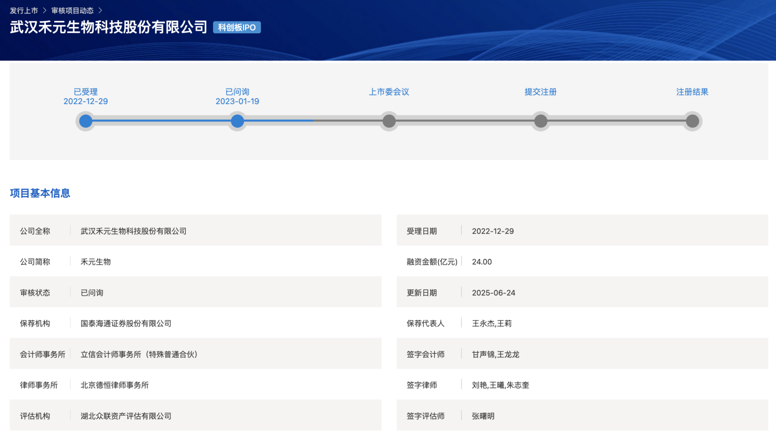 回顾申报历程,禾元生物于2022年12月29日被受理,期间经历了两轮问询,由国泰海通证券担任保荐机构。