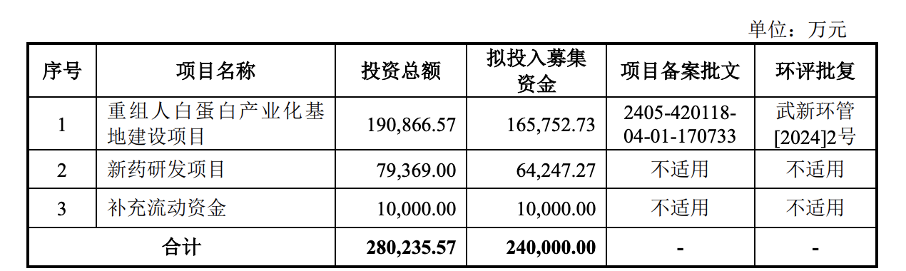 值得注意的是,禾元生物申报稿中拟募资金额为35.02亿元,但在上会稿中,募资额已缩减为24亿元,其中补充流动资金额度减少 7 亿元为调整重点。从最终募资用途来看,多数金额投入到核心在研产品上。其中,16.58亿元用于“重组人白蛋白产业化基地建设项目”、6.42亿元用于“新药研发项目”,剩余1亿元则用于补充流动资金。
