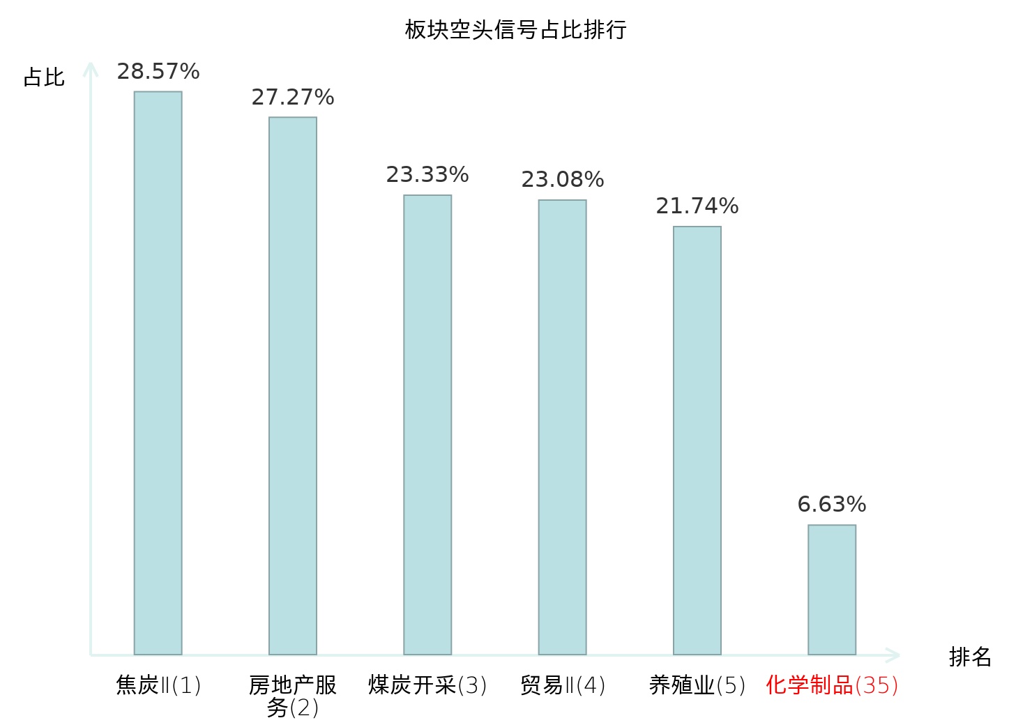 全市场所有行业板块中主力空头信号占比排名中,焦炭Ⅱ板块位居第一。养殖业板块名次提升最快,较昨日上升107位。