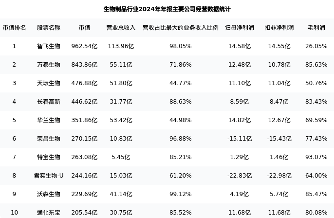 君实生物-U最新报告期数据为年报,下表汇总了生物制品行业内市值靠前的公司年报主要经营数据